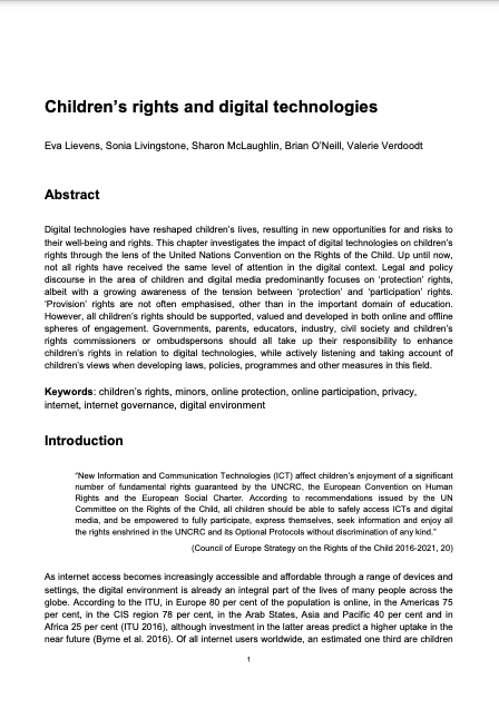 Eva Lievens, Sonia Livingstone, Sharon McLaughlin, Brian O’Neill, and Valerie Verdoodt, 2018, in Liefaard, Ton and Kilkelly, Ursula, (eds.) International Human Rights of Children. International Human Rights. Springer.